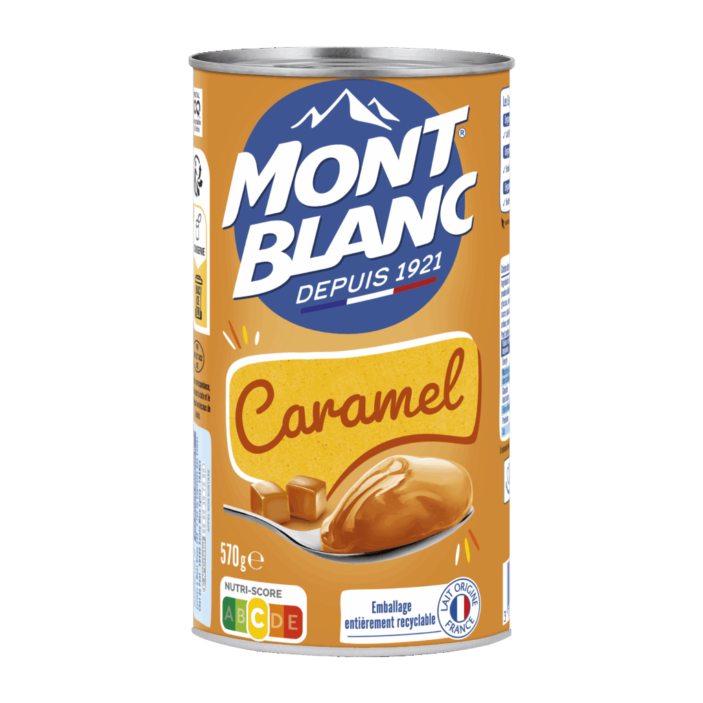 Lait origine France 78 % (lait entier concentré, poudre de lait écrémé), caramel 10 % (sucre, eau), sirop de glucose, amidon de maïs, amidon transformé de maïs, sucre, épaississants : alginate de sodium – gomme guar, arôme, correcteur d’acidité : hydroxyde de sodium.