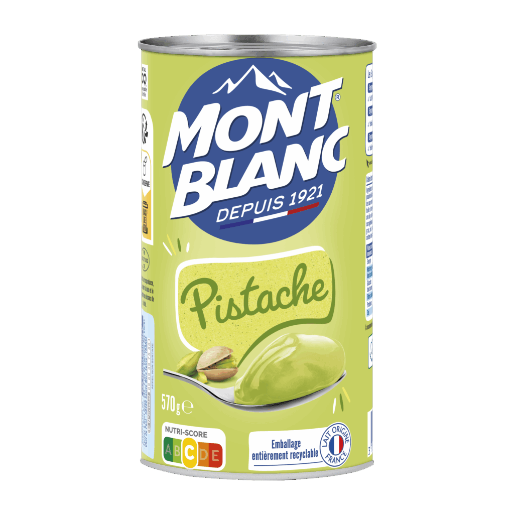 Lait origine France 78 % (lait entier concentré, poudre de lait écrémé), sucre, eau, pâte de pistache (sirop de sucre inverti, pistaches vertes de Californie 0,5 %, eau, huile de tournesol, arôme), amidon transformé de maïs, amidon de maïs, fécule de manioc, épaississant : carraghénanes, émulsifiant : mono- et diglycérides d’acides gras, sel, colorants : riboflavine – bleu patenté V. Peut contenir des traces d’autres fruits à coque.