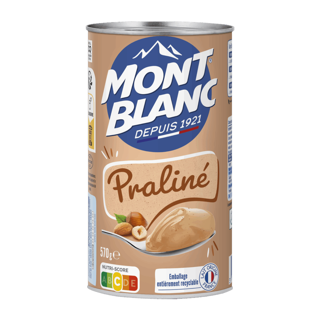 Lait origine France 82 % (lait entier concentré, poudre de lait écrémé), sucre, sirop de glucose, praliné 2,0 % (sucre, noisettes, amandes), amidon transformé de maïs, maltodextrine, amidon de maïs, épaississants : alginate de sodium – carraghénanes, arôme, sel.